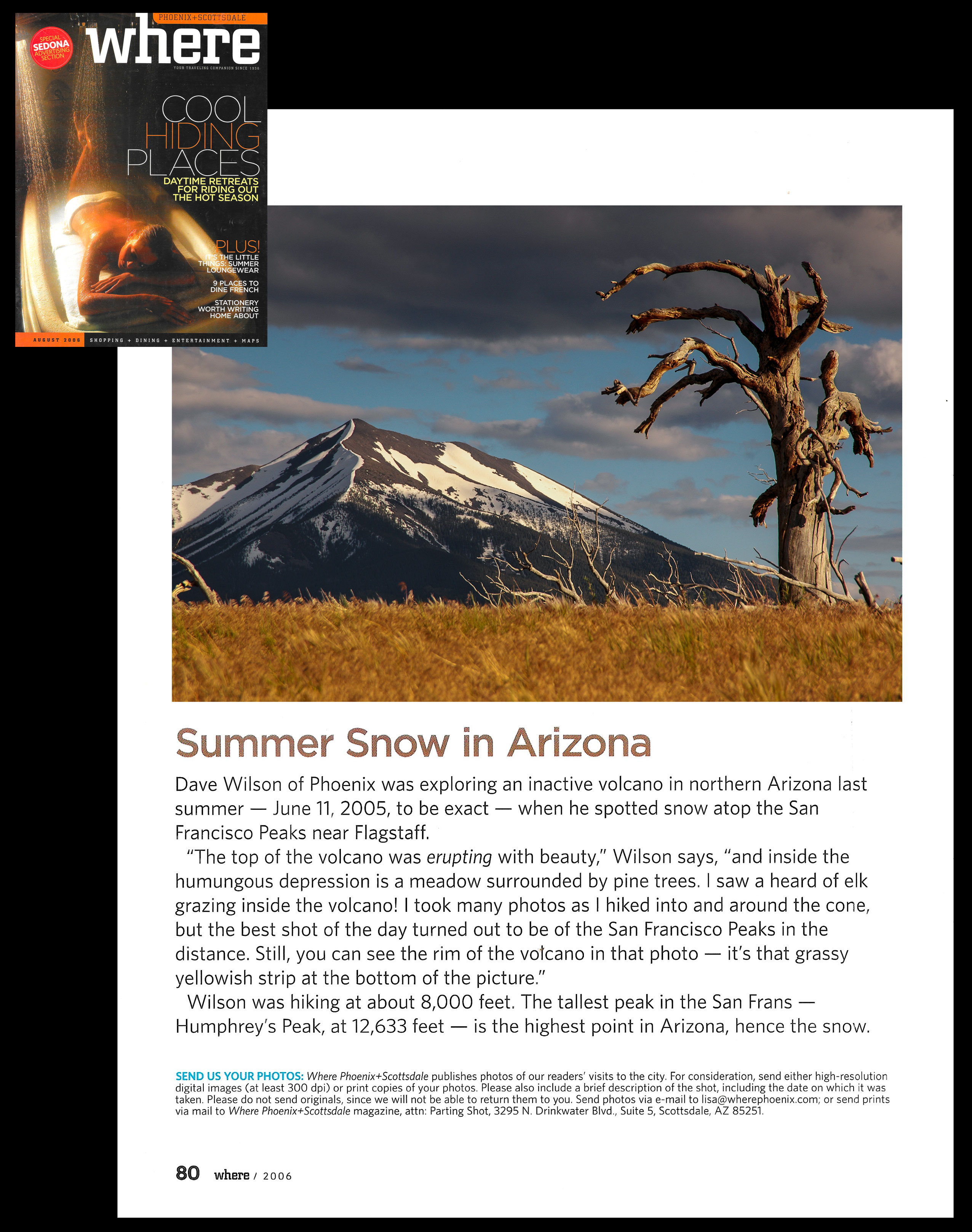 ![]() Ten photos in the October 2025 issue of Images Arizona magazine ![]() Seven-page photo essay on "Quirky Cacti" in the March 2020 issue of Images Arizona ![]() Several photos, including a two-page spread, in Arizona Images magazine ![]() Photo of West Clear Creek on the back cover of the University of Arizona Water Resources Research Center 2022 Annual Report ![]() Photo of the San Francisco Peaks on the cover of the 2023 Coconino County Emergency Operations Plan ![]() Green Valley News Sept. 4, 2010 |