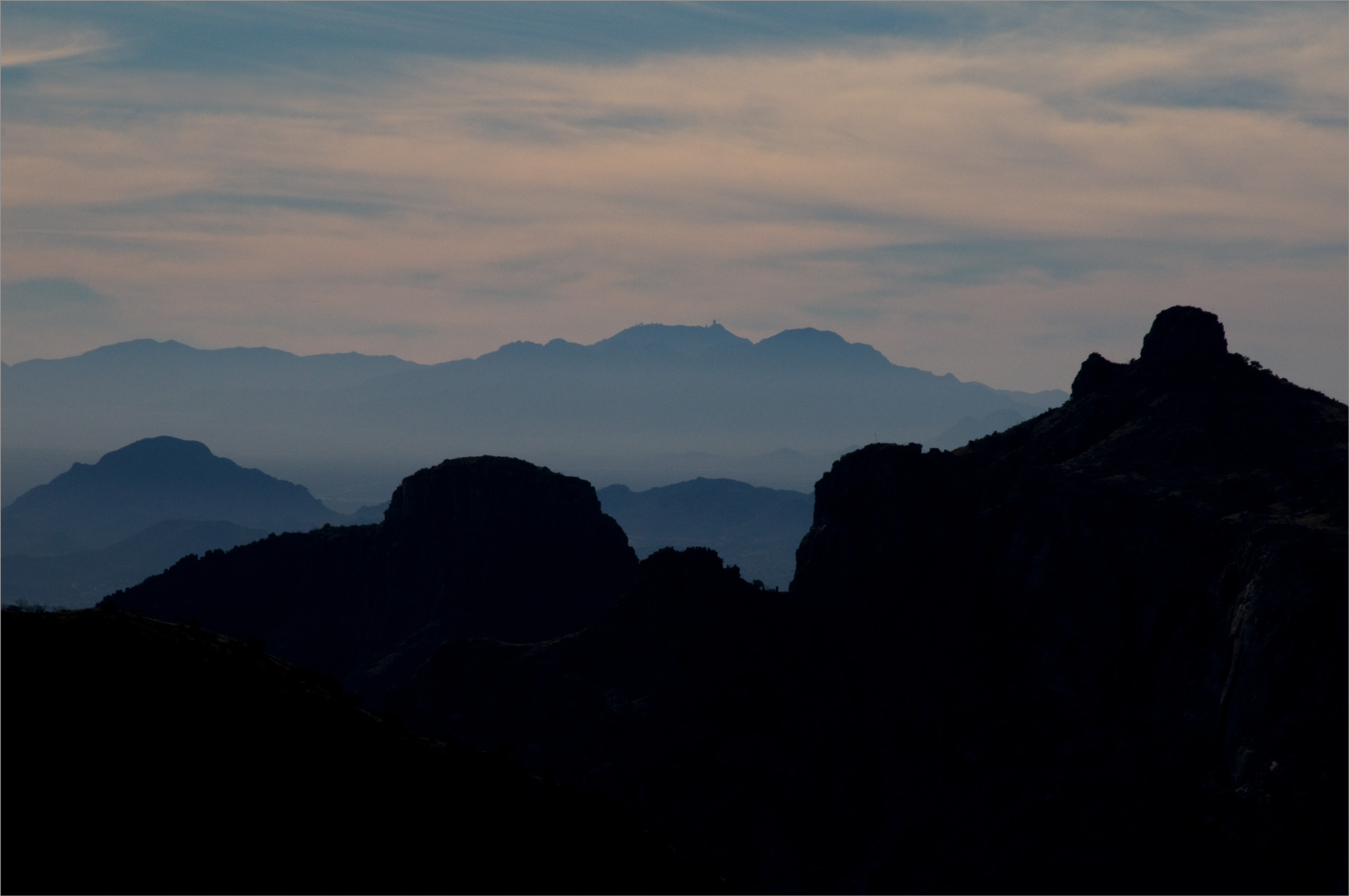 Late afternoon at Seven Cataracts Vista in the Catalinas, looking southwest. At right is Thimble Peak and in the distance are the Quinlan Mts. including Kitt Peak.Back to Gallery Photo ID: SC6 Buy Photo