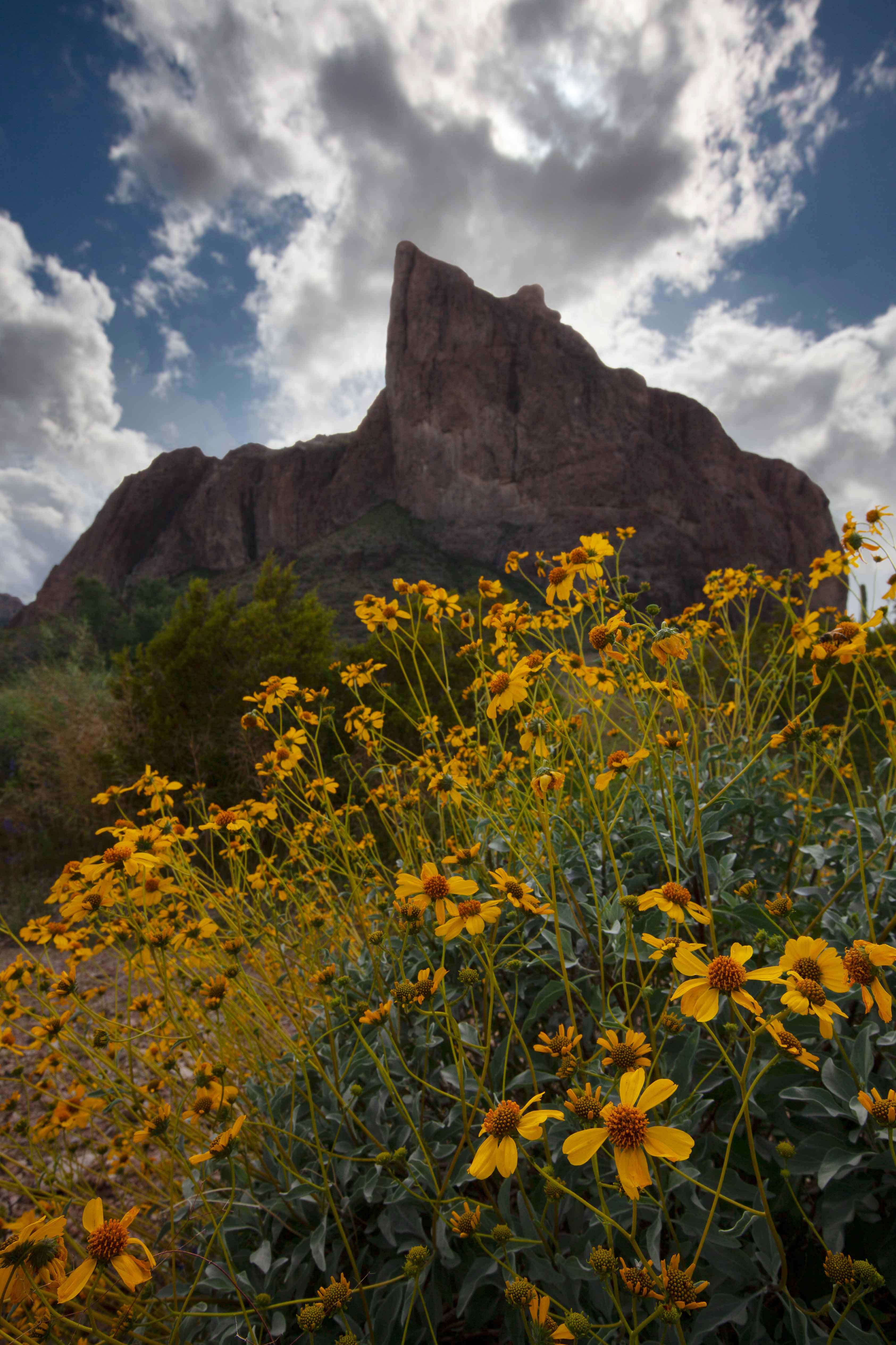Desert wildflowers (Brittlebush) beneath Courthouse Rock in the Eagletail Mts., ArizonaBack to Gallery Photo ID: ET9 Buy Photo