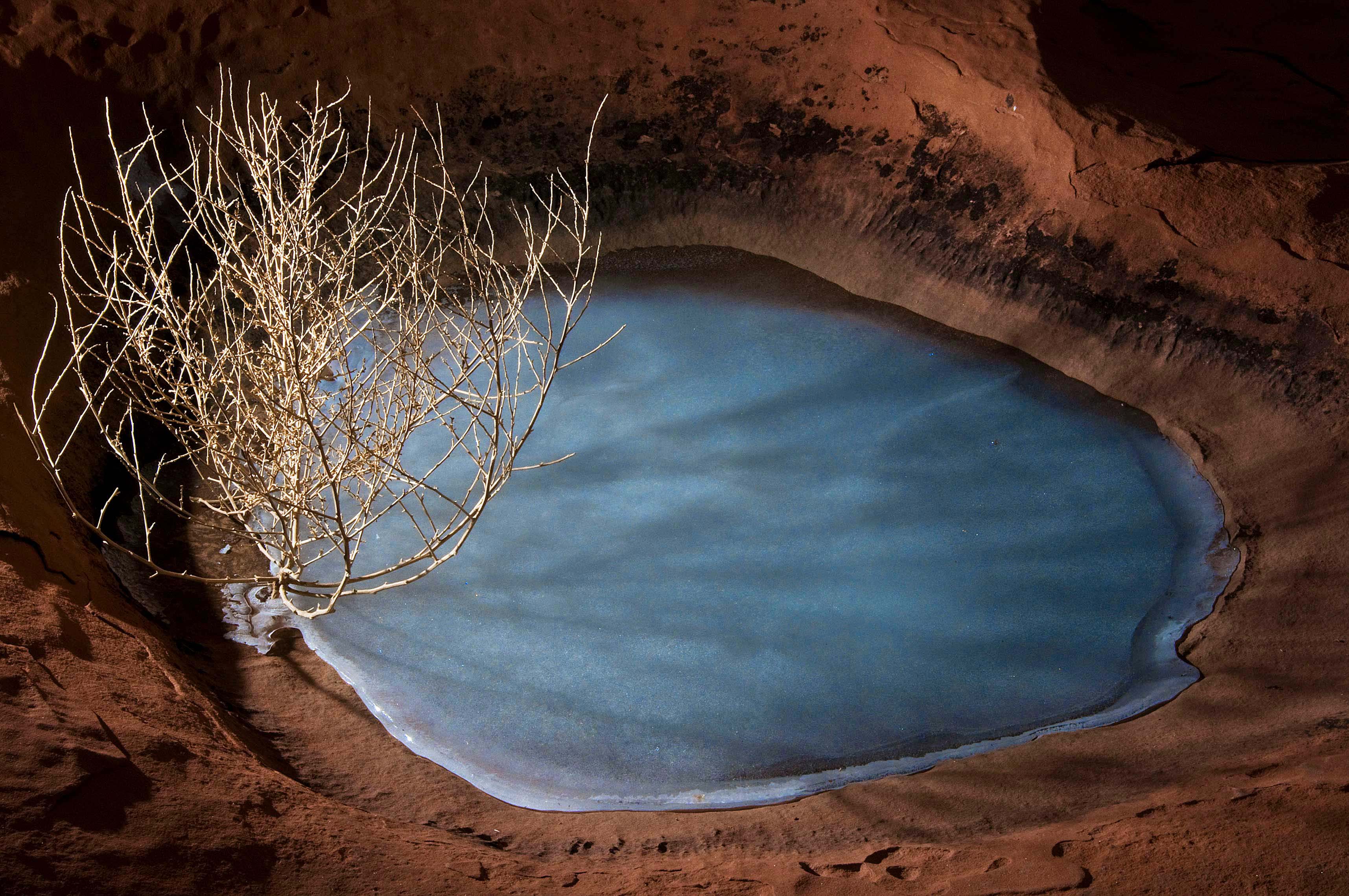 Tumbleweed near a frozen puddle in a sandstone depression in northern Arizona (flash at twilight)Back to Gallery Photo ID: HD2 Buy Photo