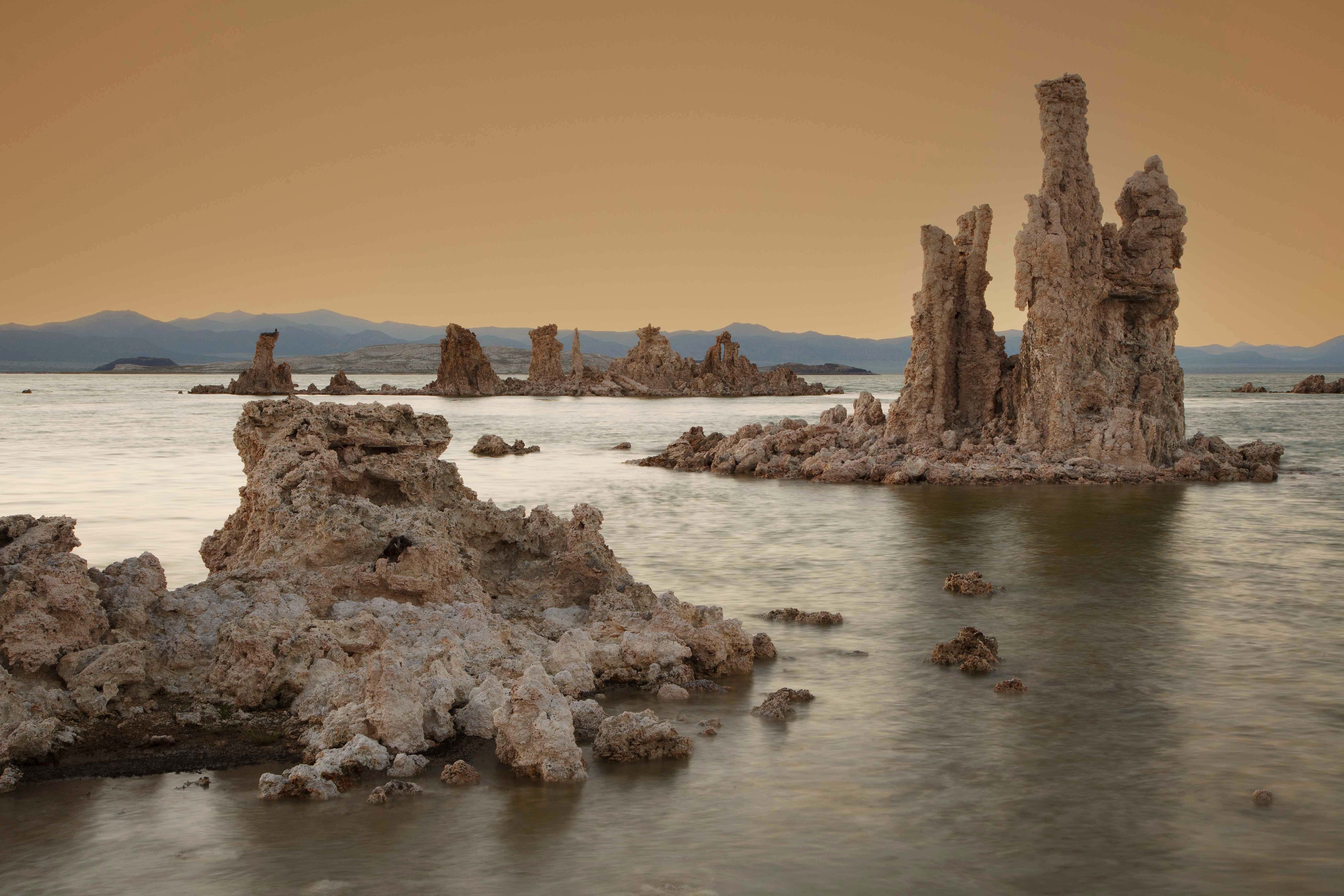 Tufa Towers in Mono Lake, California. As sunset faded to twilight, smoke from a nearby fire turned the sky extra orange.Back to Gallery Photo ID: ML1 Buy Photo