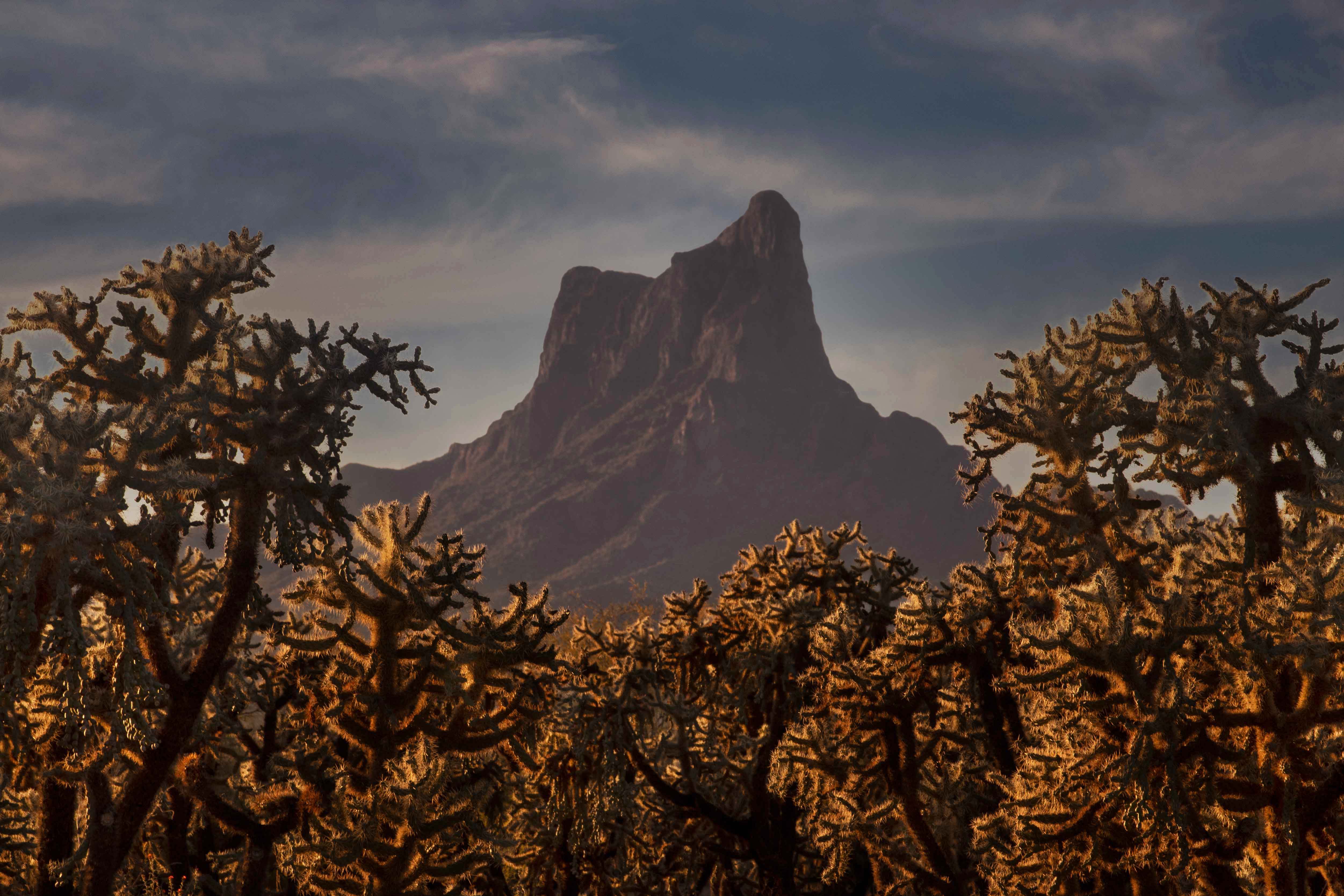 Picacho Peak towers over cholla cactus in the southern Arizona desertBack to Gallery Photo ID: PV7 Buy Photo