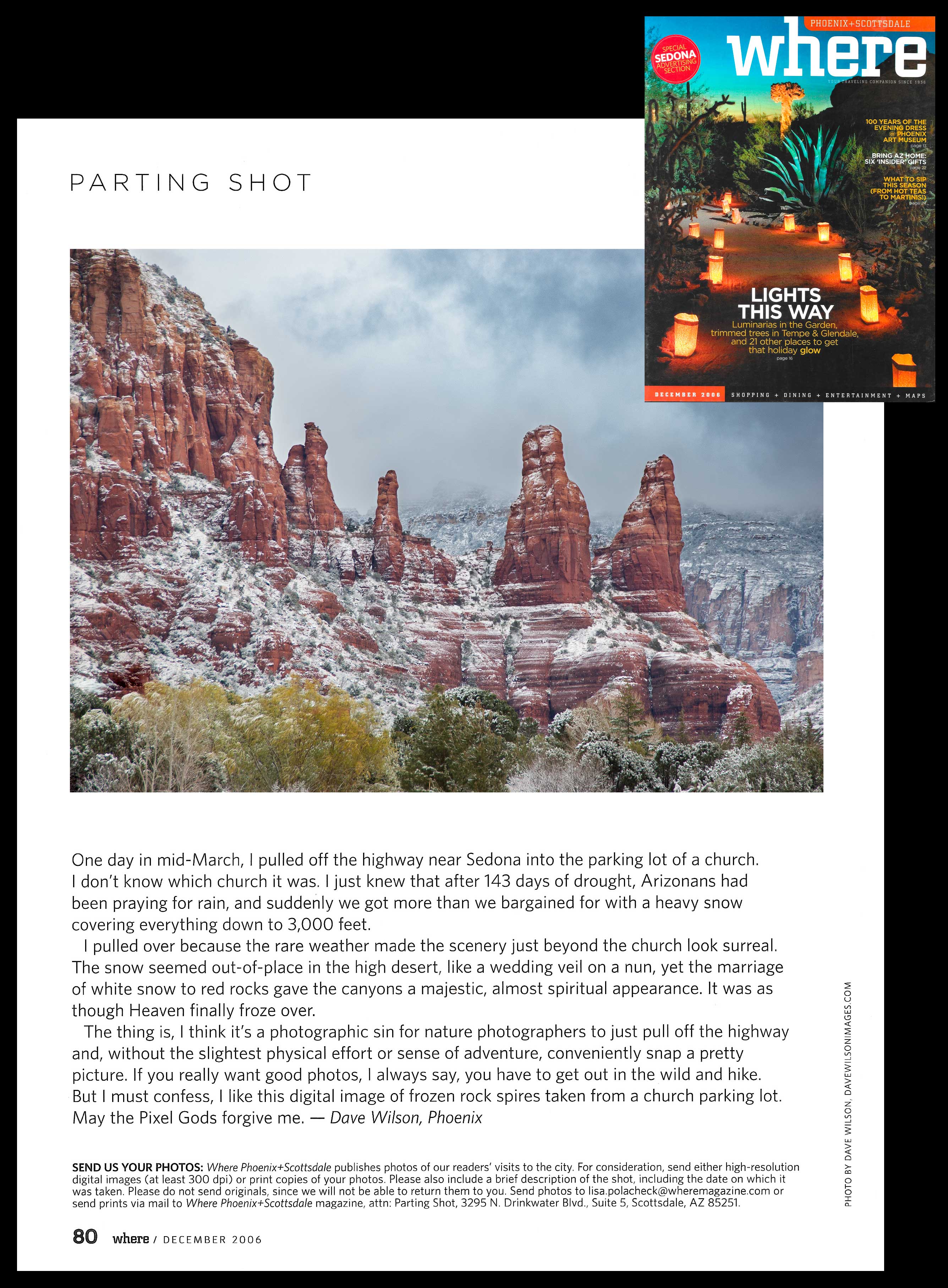 ![]() Photo of Lake Powell on the cover of YellowBook for the Page, Az. region ![]() WHERE Phoenix-Scottsdale magazine, Dec. 2006 ![]() WHERE Phoenix-Scottsdale magazine, August 2006 ![]() Photo Watson Lake in the Arizona Republic's "Explore Arizona" section ![]() Photo of the Grand Canyon in the East Valley Tribune ![]() Photo of the Grand Canyon (and info about me) in the May 2011 issue of Kudos, an arts publication in Sedona ![]() A whole book full of photos of archaeological sites in the wild. For details click HERE. |